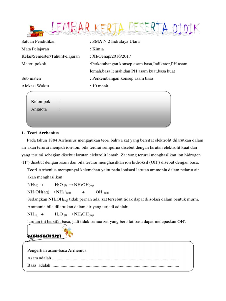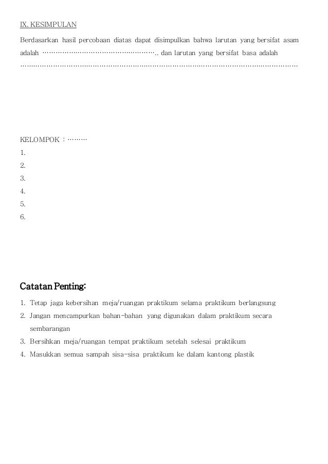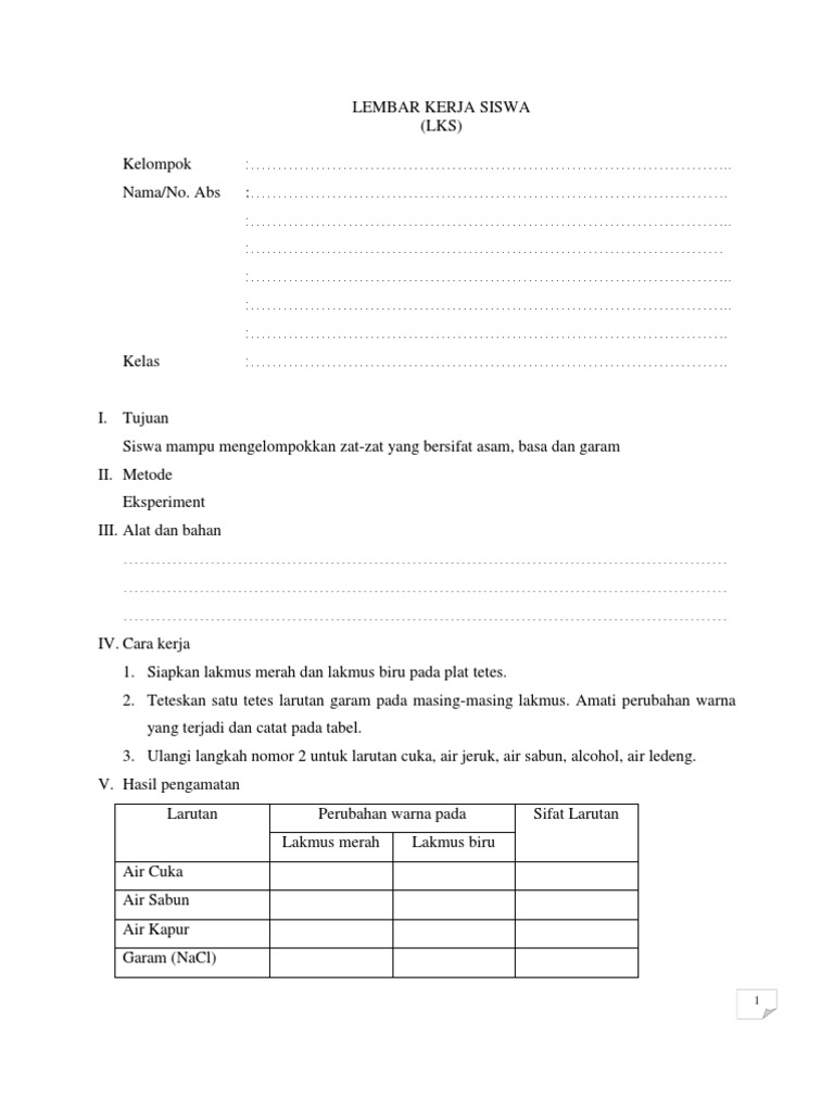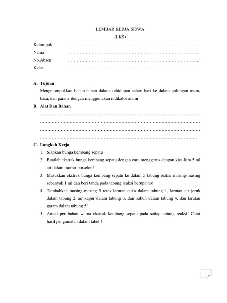 Download disini untuk susunan yang lebih rapih. Lks asam basa lembar kerja siswa. 1 gelas plastik bekas transparan 2 pipet tetes 3 lumpang dan penumbuk 4 cutter 5 pengaduk 6 cuka dapur 7 air mineral 8 naoh 9 kunyit 10 daun rhoe discolour 11 bunga kembang telang. Indikator asam basa yang sedang dipelajari dalam bentuk lks (lembar kerja siswa) yang disajikan dan mencoba menginterprestasikannya. Siswa dapat membuat indikator alami untuk menguji larutan asam basa b alat dan bahan : Kimia kelas / semester : Lks asam, basa, garam dan indikator lembar kerja siswa 0 5 sifat asam basa Posted by muhammad ardiansyah on 20.10 with 2 comments. Lks praktikum asam basa lembar kerja siswa.