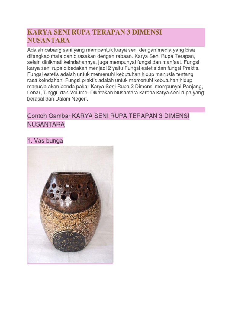 Seni rupa 3 dimensi merupakan karya seni yang dibatasi tidak hanya dengan sisi panjang dan lebar, tetapi juga dibatasi oleh kedalaman. Kata tersebut berkaitan erat dengan upacara keagamaan yang disebut kesenian. Salah satu karya seni yang banyak ditemukan diberbagai sudut dalam ruangan maupun luar ruangan disekitaran kita adalah seni rupa. Seni rupa 3 dimensi adalah karya seni yang tak hanya datar. Karya seni rupa 3 dimensi hasil modifikasi (seni patung) pengertian karya seni rupa 3 dimensi hasil modifikasi adalah karya seni rupa berbentuk 3 dimensi yang dikerjakan dengan cara membuat gubahan dari bentuk yang sudah ada menjadi bentuk baru. Cabang seni rupa yang menciptakan alat komunikasi dengan gambar yaitu. Berbeda dengan karya seni rupa 2 dimensi, pada seni rupa 3 dimensi juga memiliki sisi panjang dan lebar ditambah dengan mempunyai ruang atau volume dalam karya seni jenis ini. Contoh seni rupa terapan dua dimensi antara lain kain songket, kain batik, gambar ilustrasi, iklan, poster, dan karya desain komunikasi visual lainnya. Yang pertama adalah seni rupa murni, dan yang kedua adalah seni rupa terapan. Karya seni rupa tiga dimensi terapan karya seni ini dibuat untuk tujuan fungsional atau untuk memenuhi kebutuhan fisik dan psikis.